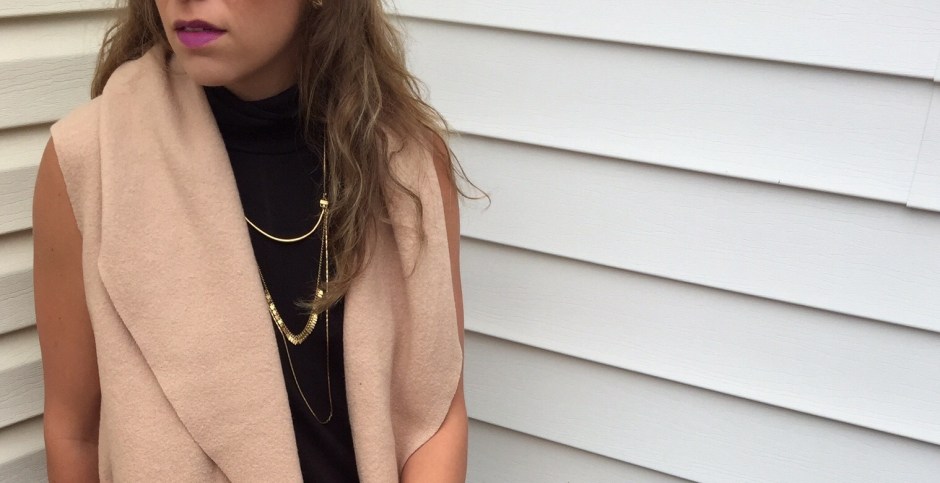 VEST: Anthropologie | SWEATER DRESS: Anthropologie | NECKLACE: old (similar here) | WATCH: Michael Kors | EARRINGS: Rebecca Minkoff | BOOTS: Frye | LIPS: MAC
