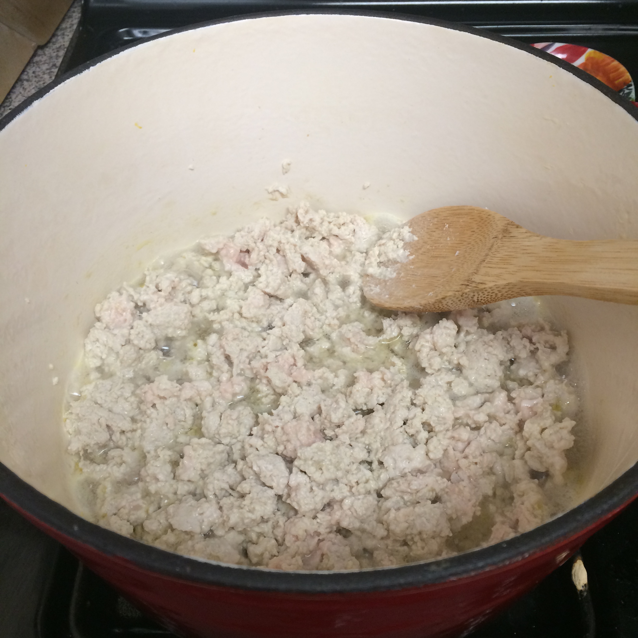2. Add the turkey and cook, breaking up chunks with the side of a wooden spoon, until browned, about 5 minutes.