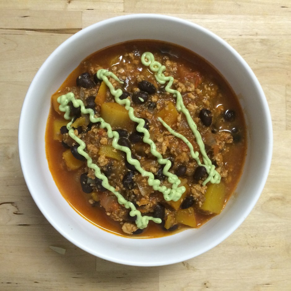 Butternut Squash, Black Bean and Turkey Chili with Avocado Crema