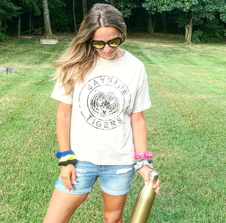 If you follow me on Facebook or Instagram, you’ve most likely seen my desperate posts about our venue owner stealing A LOT of money from us and closing down the venue 5 weeks before our wedding. Re-planning a wedding that you’ve spent over 15 months planning, in only 5 weeks is NOT easy. So, all I can think about is how easy life was when we were kids. I decided to bring a little nostalgia back this week, in hopes of reliving a time that was stress and anxiety-free. I can’t say it fixed my problems, but wearing this Bayside Tigers tee and some scrunchies really made me feel on top of the world like Kelly Kapowski.